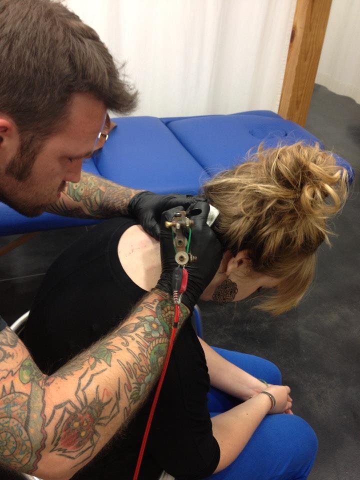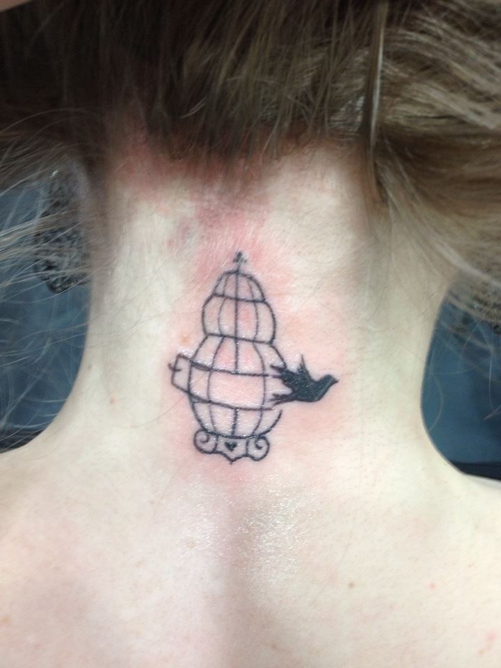 Once upon a time there was a scared little girl who thought she was tough. She knew she wanted to get a tattoo but she also knew those suckers last forever so she had to be sure. She picked out her adorable little design and then waited…and waited…then she decided to wait some more. When she was done waiting she waited even longer still. Finally, when even she was tired from all the delay, she put on her big girl pants and drove to the magical land of Dogstar Tattoo Company. It was a strange place with dragons and other mystical creatures everywhere (that parts true, there were sketches of them everywhere). So back in the room the wonderful, magical artist took out his wand…and repeatedly stabbed her in the back of the neck. And then, like a butterfly from a cocoon, from the mess a beautiful birdcage emerged in its place.