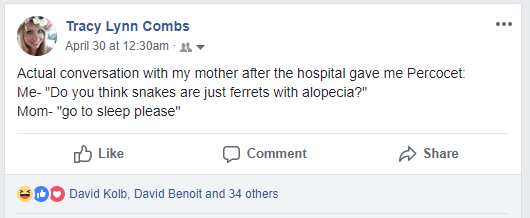 Me: “I’m just kidding. Please give me more medicine and/or remove all of the organs from my lower abdomen.”
